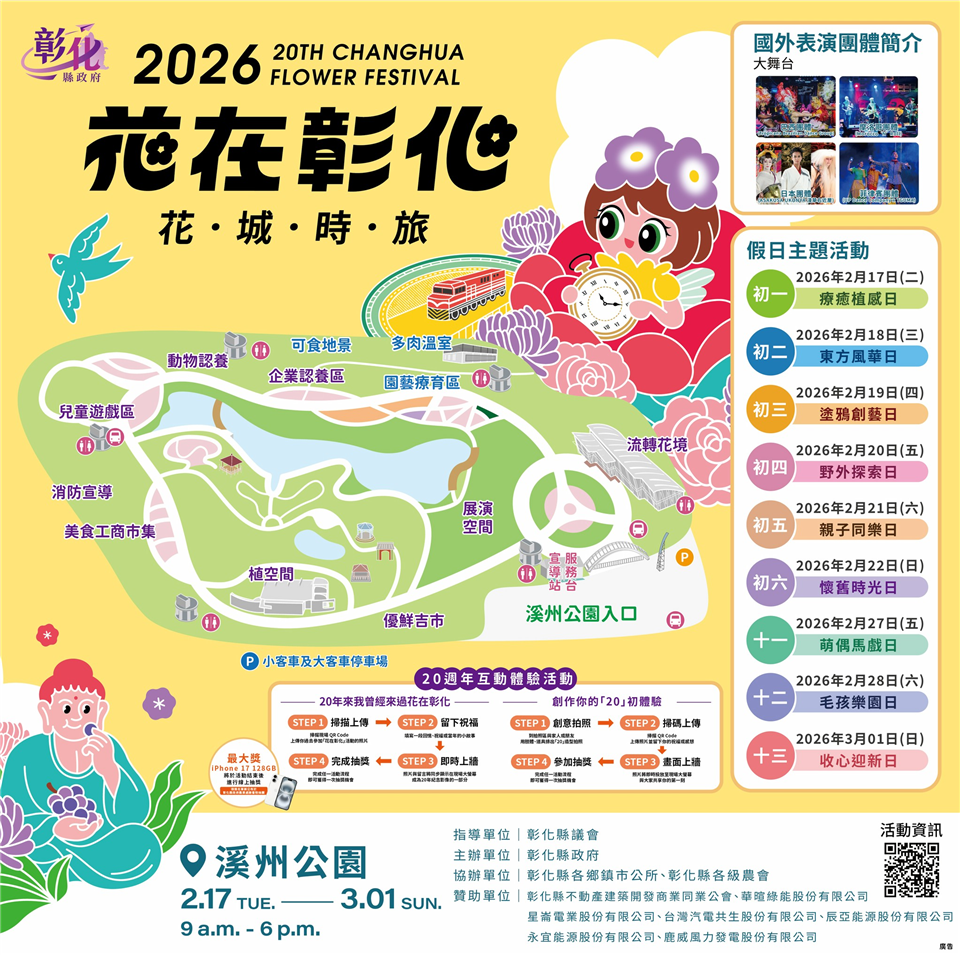 彰化縣政府表示,誠摯邀請全國民眾,今年春節一定要來彰化,一起踏上20周年的「花城時旅」。白天在溪州公園賞花,晚上逛八卦山月影燈季,保證讓大家在彰化度過最難忘、最精彩的春節假期!